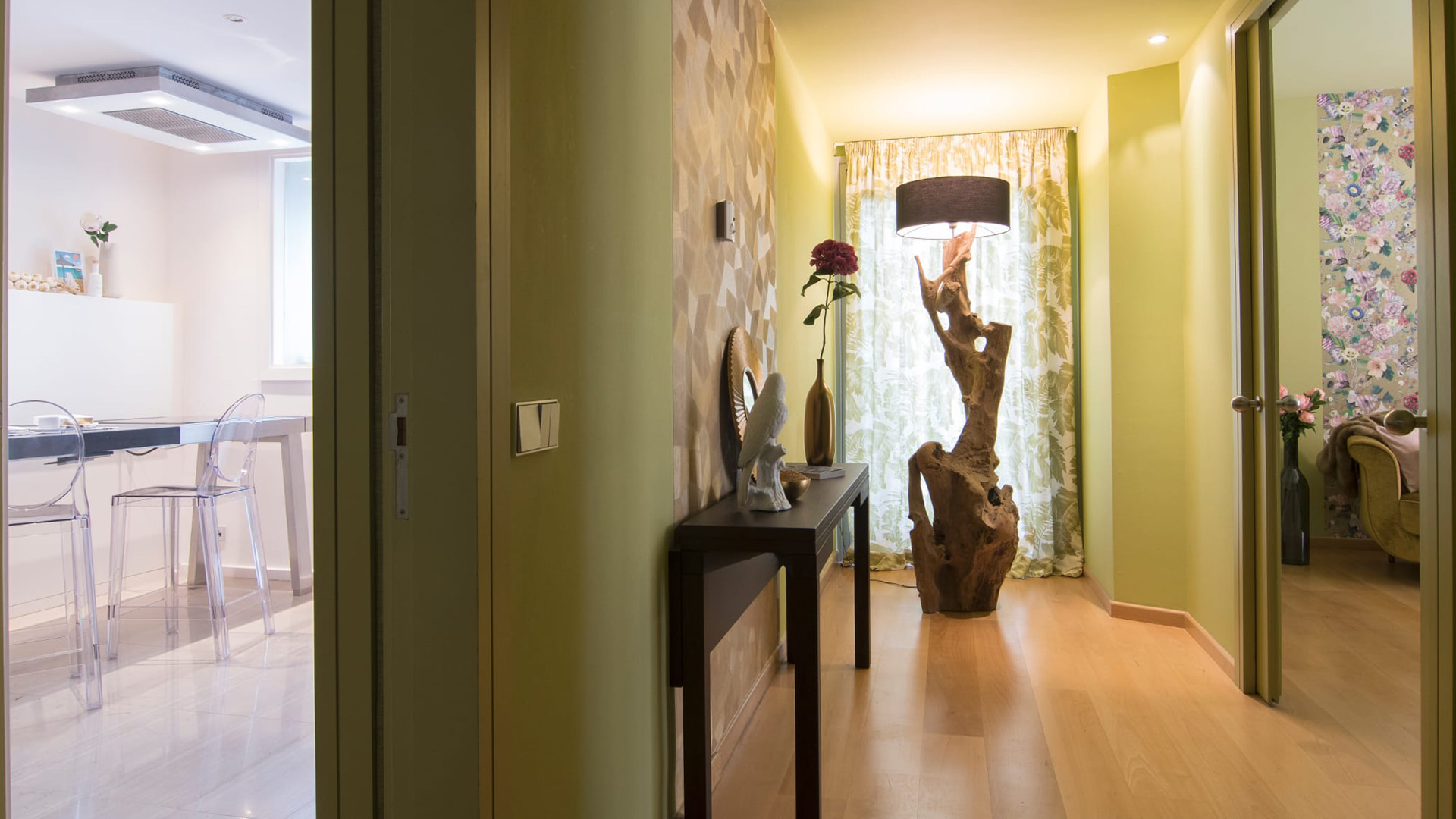 Since 2016, the apartment shines in new splendor and presents itself in a very special style of furnishing. On an area of 151 m², a spacious living-dining room with balcony, a design kitchen of the brand Bulthaup and two bedrooms, one of them with bathroom en suite, a guest toilet and a balcony of about 9 m² are distributed. Large windows let a lot of light into the rooms. The play of green and rosé colours runs through the spacious rooms and creates a special atmosphere. The large, shared patio with old trees rounds off this special oasis of well-being in the heart of the old town of Palma.